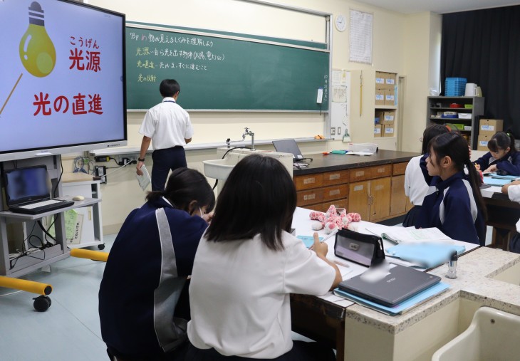 10月22日(水)理科の授業の様子です。今日のめあては「ものが見える仕組みを理解しよう」です。光源装置と鏡を使って、各グループで「光源」「光の直進」「光の反射」を確認しています。また、「光の色」についての実験動画も集中してみていました。